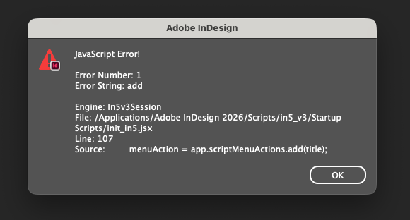 Some of our team have gotten this error and its unclear how to resolve. In addition the in5 menu dropdown in the top bar only displays Interactive Widgets. Removing the in5 and Ajar production folders from the InDesign folder per the uninstallation instructions does not resolve the issue and the top bar menu remains unchanged, displaying only the Interactive Widgets option in the dropdown.
